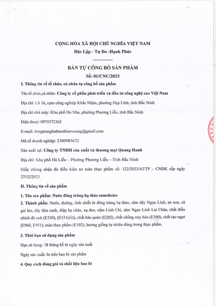 - Tên sản phẩm: Thức Uống Bổ Dưỡng Đông Trùng Hạ Thảo SUMCHOICE